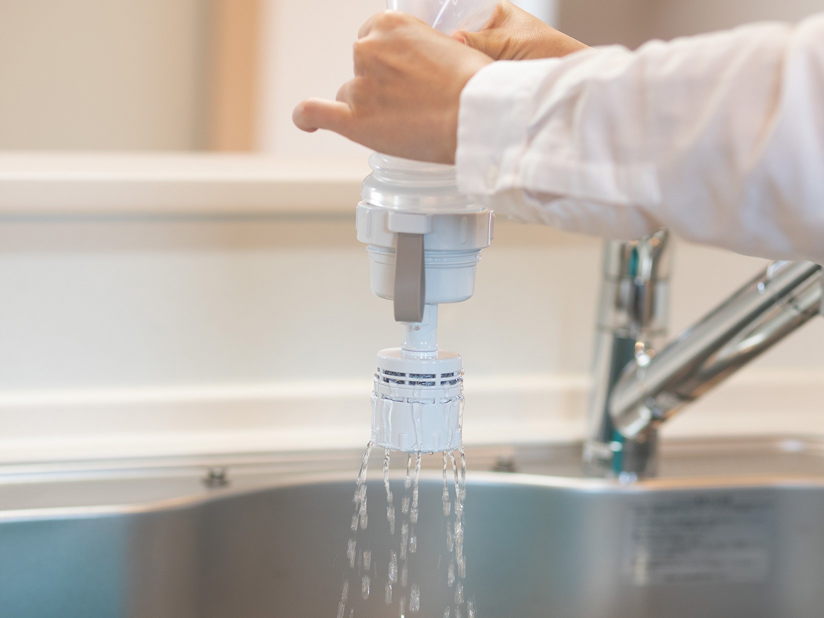 ・カートリッジを反対に取り付けて、逆流洗浄を行うことで、水道水の塩素により、内部まで殺菌消毒ができます。