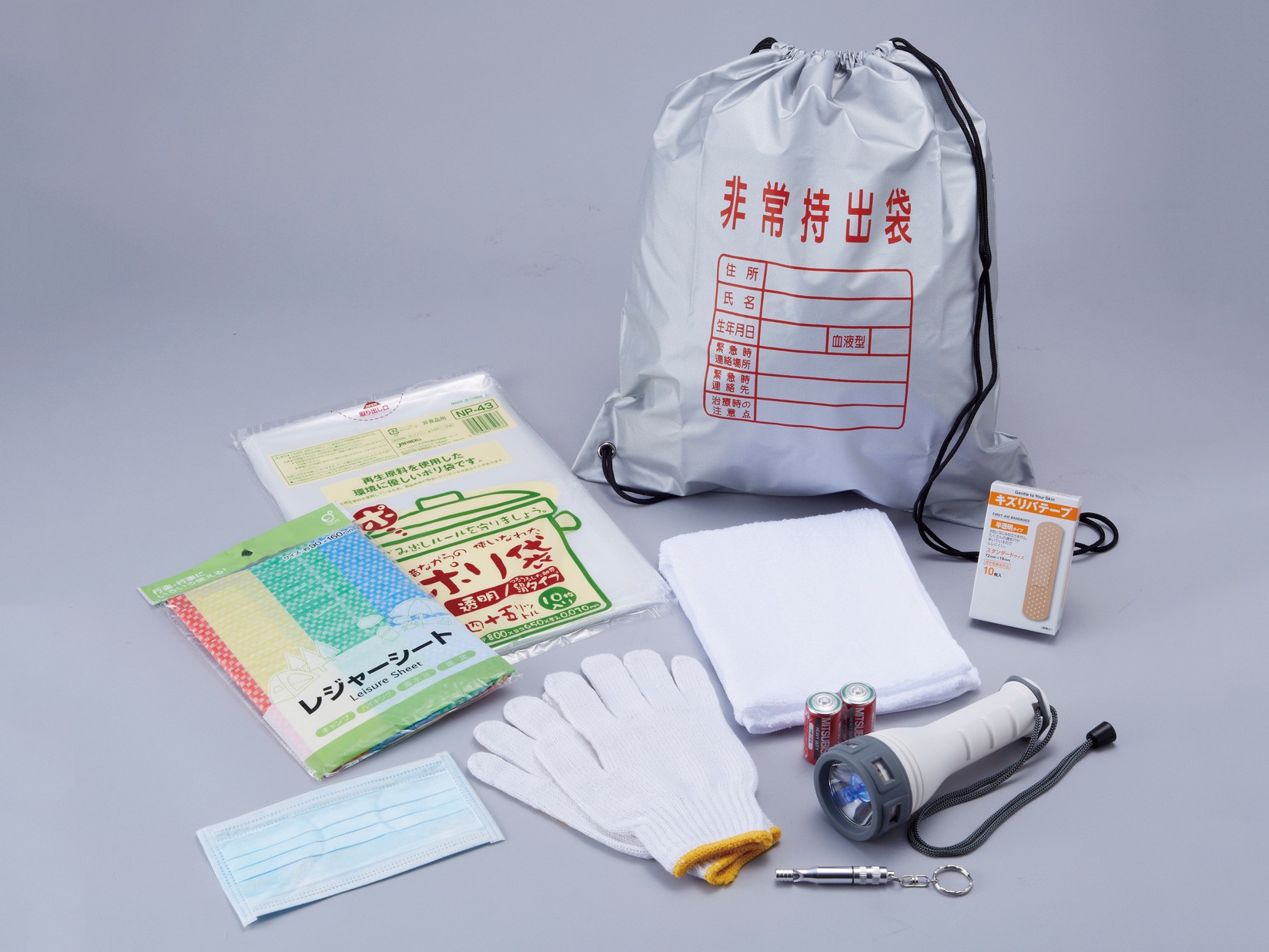 ・ABO-54…非常持出袋の中にスーパーライト・ホイッスル・レジャーシート等がセットされています。